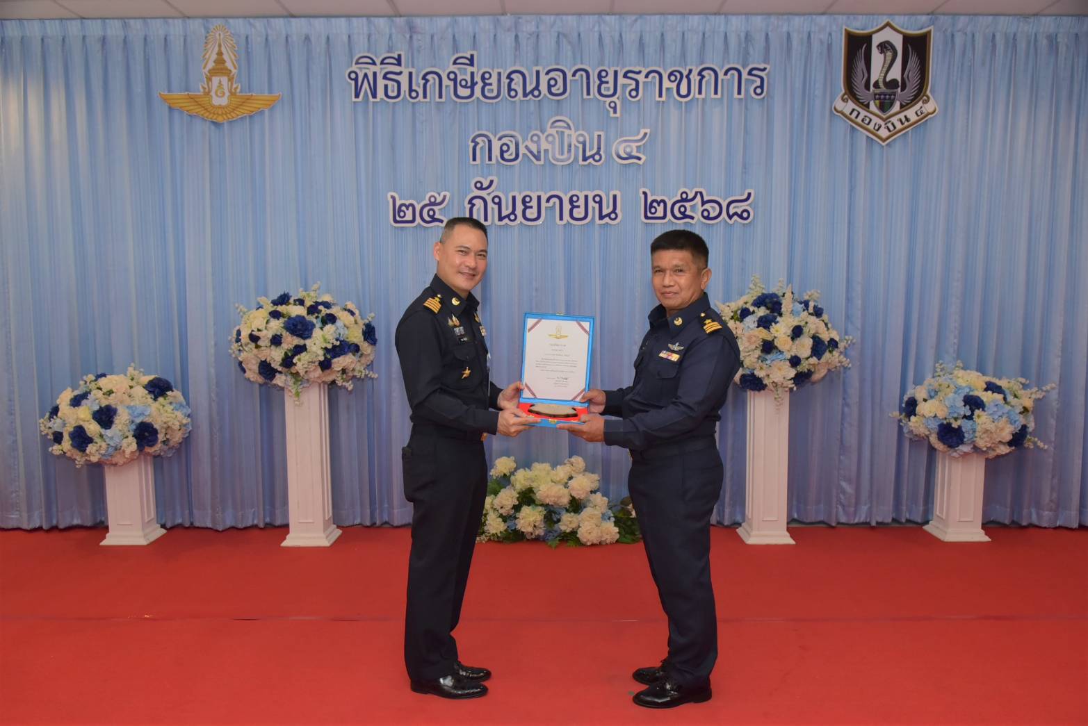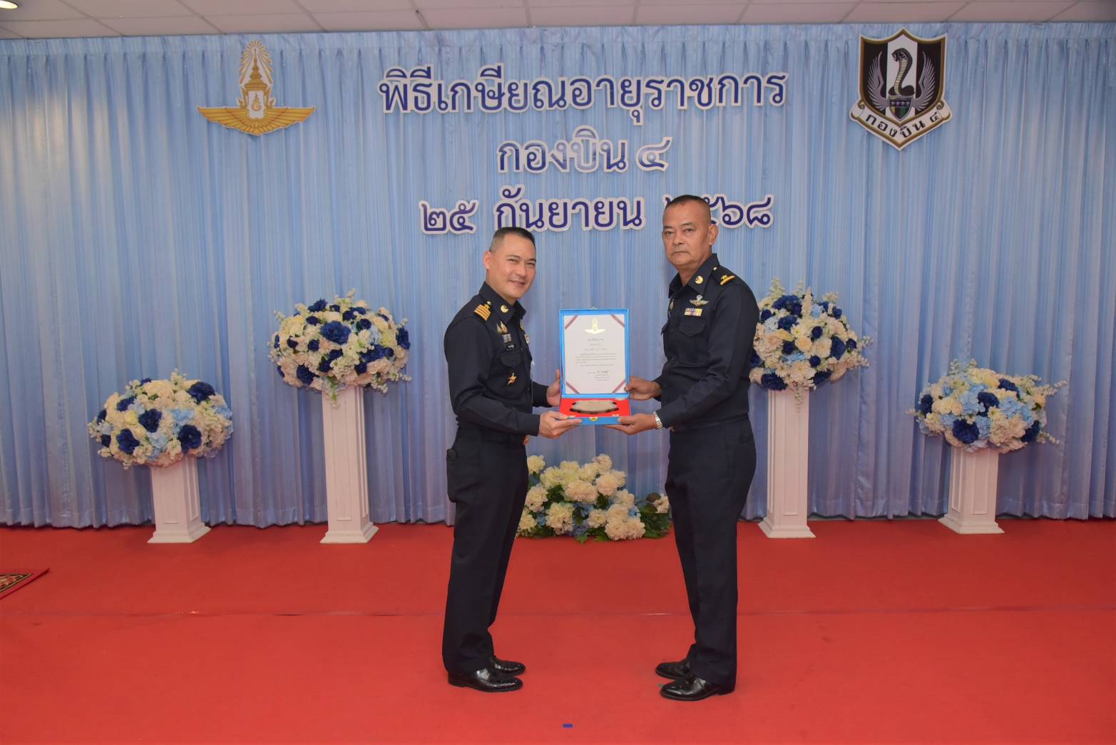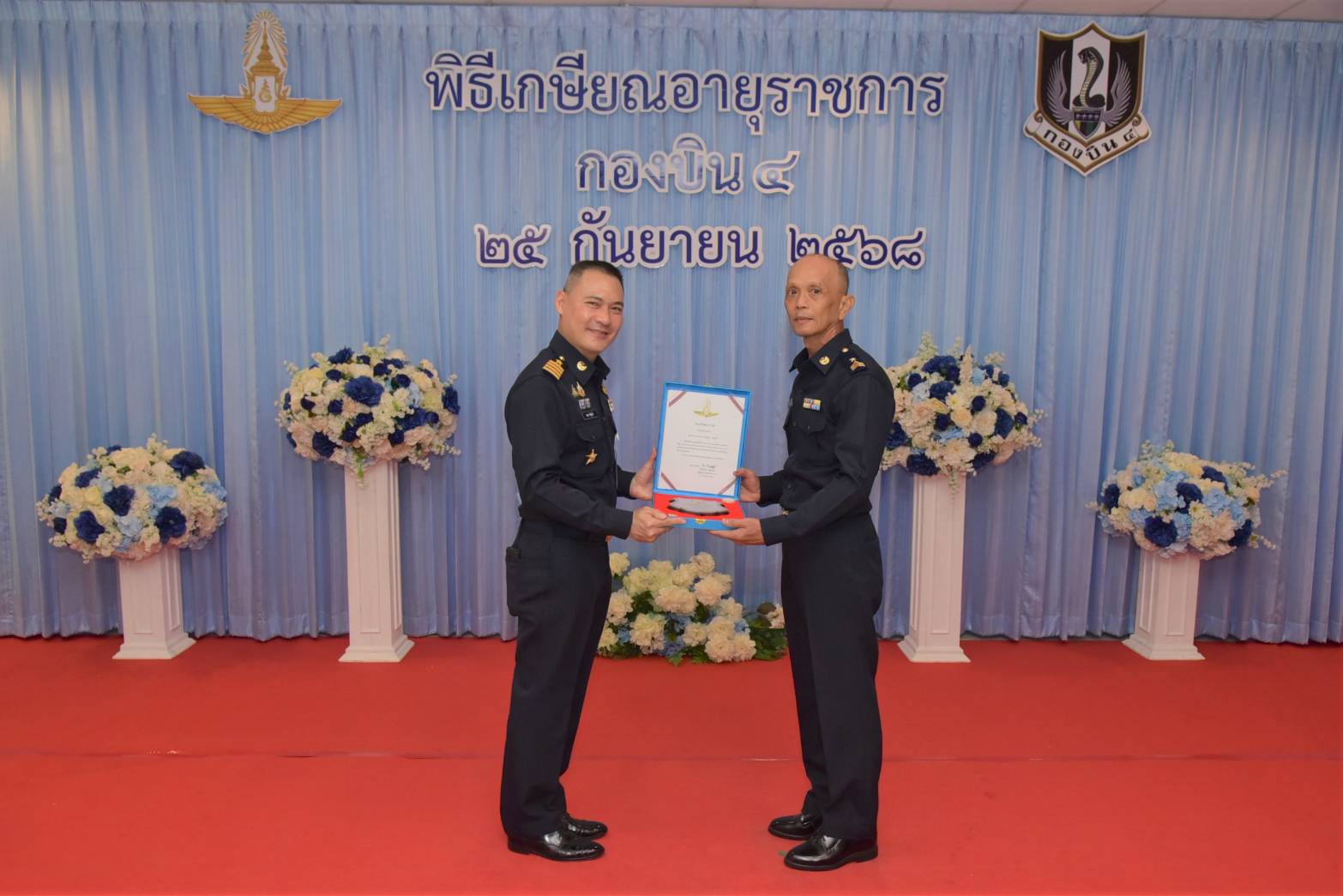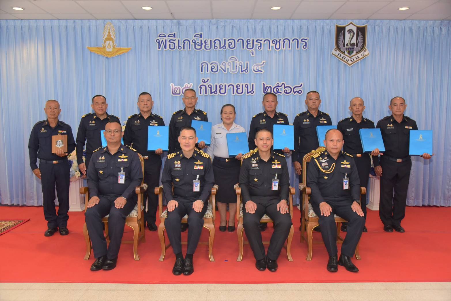 นาวาอากาศเอก วรพล ดิษฐ์แก้ว ผู้บังคับการกองบิน ๔ เป็นประธานในพิธีเกษียณอายุราชการ ประจำปี ๒๕๖๘ พร้อมกับอ่านสารแสดงความรู้สึกจากผู้บัญชาการทหารอากาศ ต่อผู้ที่ปฏิบัติหน้าที่ราชการจนครบเกษียณอายุราชการ เป็นผู้ที่ได้อุทิศตน เสียสละแรงกาย แรงใจ และความรู้ความสามารถในการรับใช้กองทัพอากาศและประเทศชาติด้วยความวิริยะอุตสาหะ สมควรได้รับการยกย่องเชิดชูเกียรติ อีกทั้งยังได้มอบโล่เกียรติคุณ และของที่ระลึกแก่ผู้เกษียณอายุราชการ เพื่อเป็นเครื่องหมายแห่งความภาคภูมิใจ และเป็นแบบอย่างที่ดีแก่กำลังพลกองทัพอากาศต่อไป ณ ท่าอากาศยานทหาร กองบิน ๔ อำเภอตาคลี จังหวัดนครสวรรค์ เมื่อวันที่ ๒๕ กันยายน ๒๕๖๘