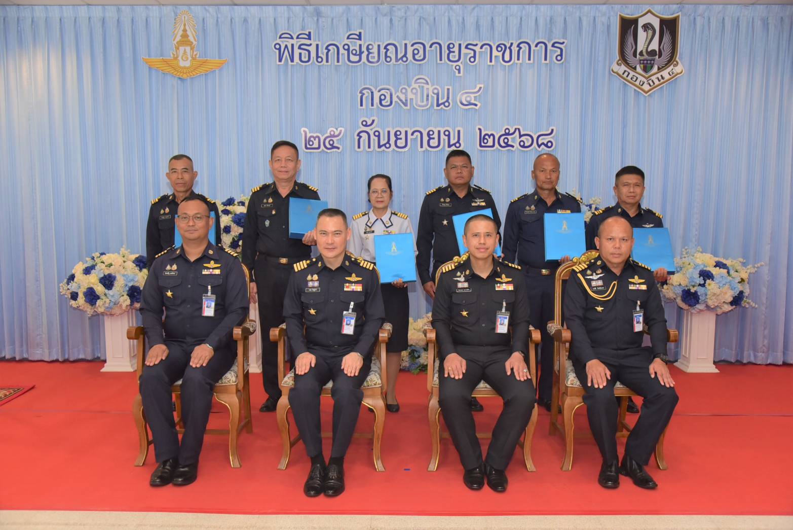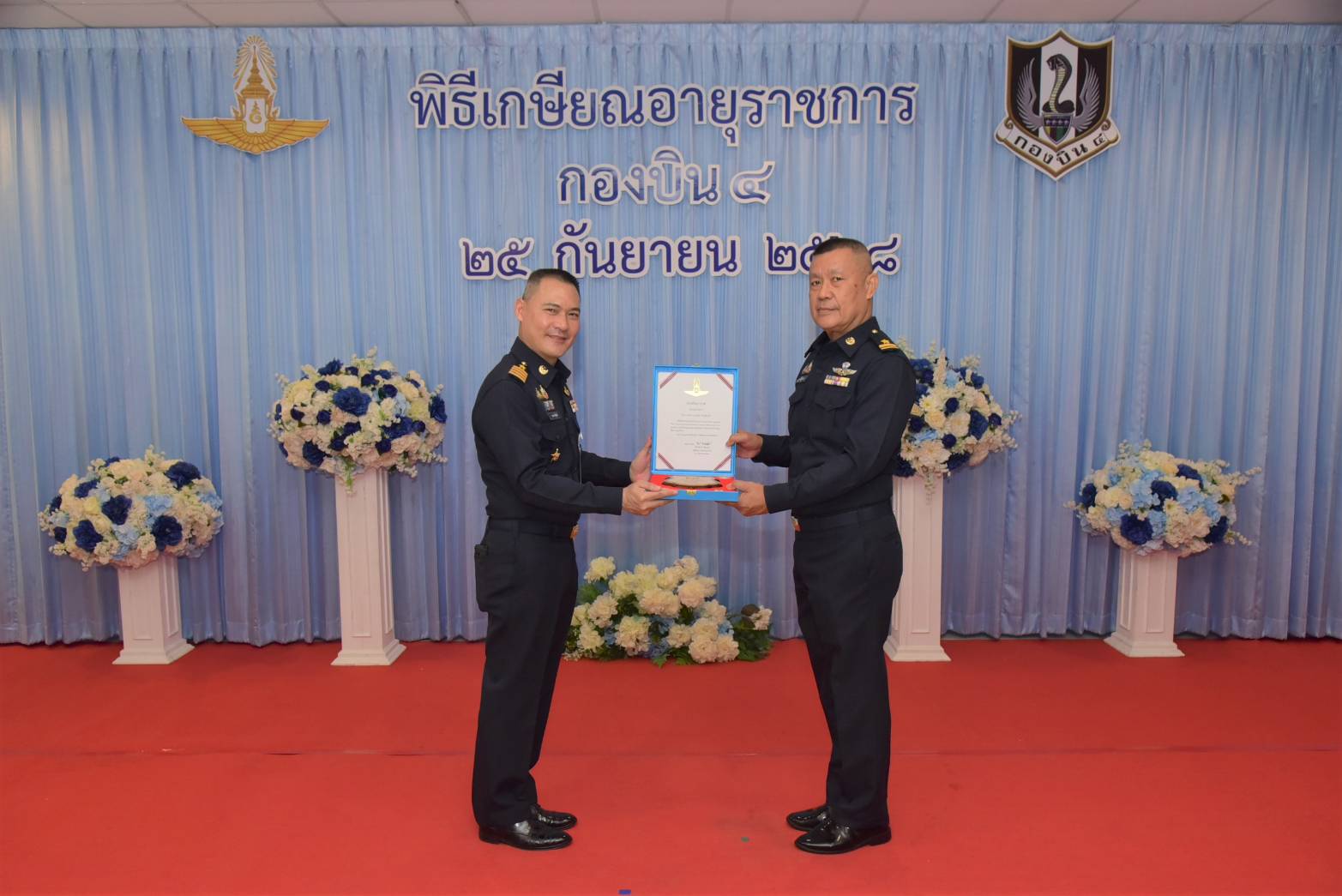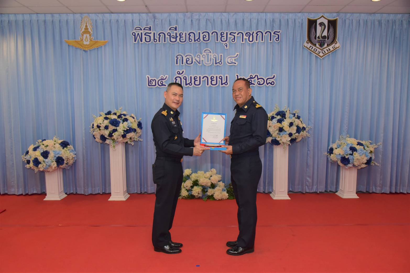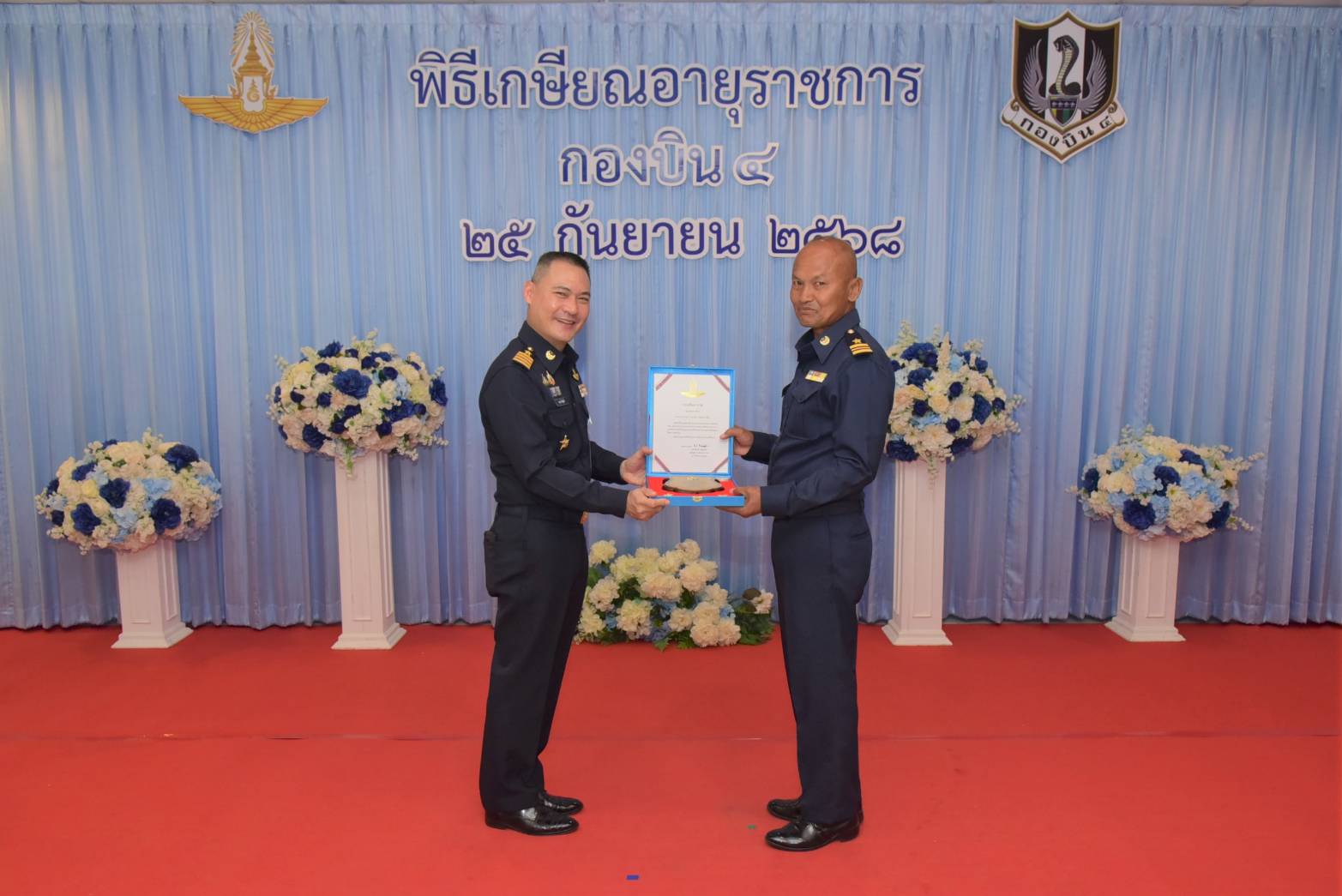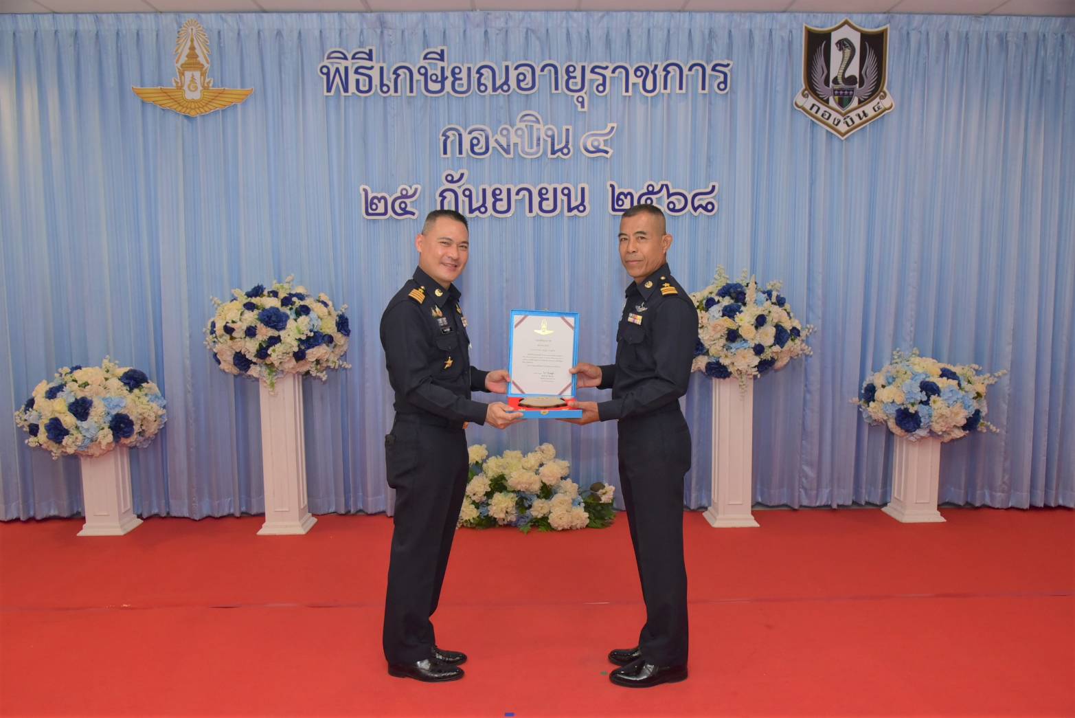 นาวาอากาศเอก วรพล ดิษฐ์แก้ว ผู้บังคับการกองบิน ๔ เป็นประธานในพิธีเกษียณอายุราชการ ประจำปี ๒๕๖๘ พร้อมกับอ่านสารแสดงความรู้สึกจากผู้บัญชาการทหารอากาศ ต่อผู้ที่ปฏิบัติหน้าที่ราชการจนครบเกษียณอายุราชการ เป็นผู้ที่ได้อุทิศตน เสียสละแรงกาย แรงใจ และความรู้ความสามารถในการรับใช้กองทัพอากาศและประเทศชาติด้วยความวิริยะอุตสาหะ สมควรได้รับการยกย่องเชิดชูเกียรติ อีกทั้งยังได้มอบโล่เกียรติคุณ และของที่ระลึกแก่ผู้เกษียณอายุราชการ เพื่อเป็นเครื่องหมายแห่งความภาคภูมิใจ และเป็นแบบอย่างที่ดีแก่กำลังพลกองทัพอากาศต่อไป ณ ท่าอากาศยานทหาร กองบิน ๔ อำเภอตาคลี จังหวัดนครสวรรค์ เมื่อวันที่ ๒๕ กันยายน ๒๕๖๘