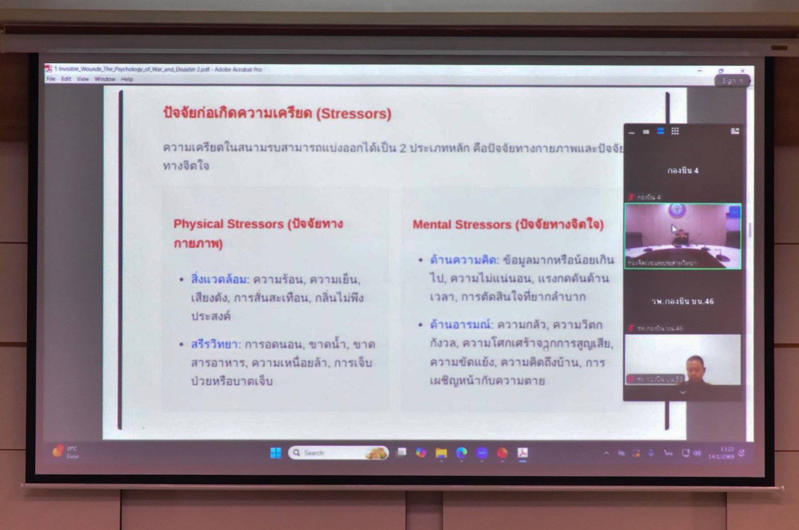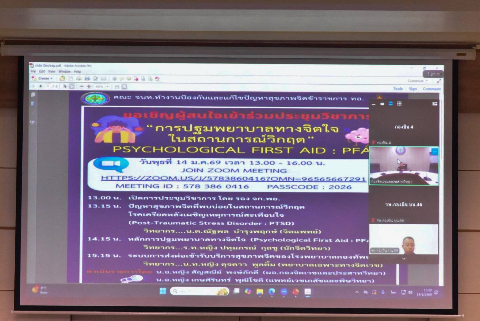 กองบิน ๔ ร่วมประชุมวิชาการ “การปฐมพยาบาลทางจิตใจในสถานการณ์วิกฤต” PSYCHOLOGICAL FIRST AID : PFA (ผ่านระบบ zoom) จัดโดยคณะเจ้าหน้าที่ทำงานป้องกันและแก้ไขปัญหาสุขภาพจิตข้าราชการกองทัพอากาศ โดยมีข้าราชการที่สนใจเข้าร่วมรับฟังการประชุม ฯ ณ ห้องประชุม ฝูงบิน ๔๐๓ กองบิน ๔ อำเภอตาคลี จังหวัดนครสวรรค์ เมื่อวันที่ ๑๔ มกราคม ๒๕๖๙