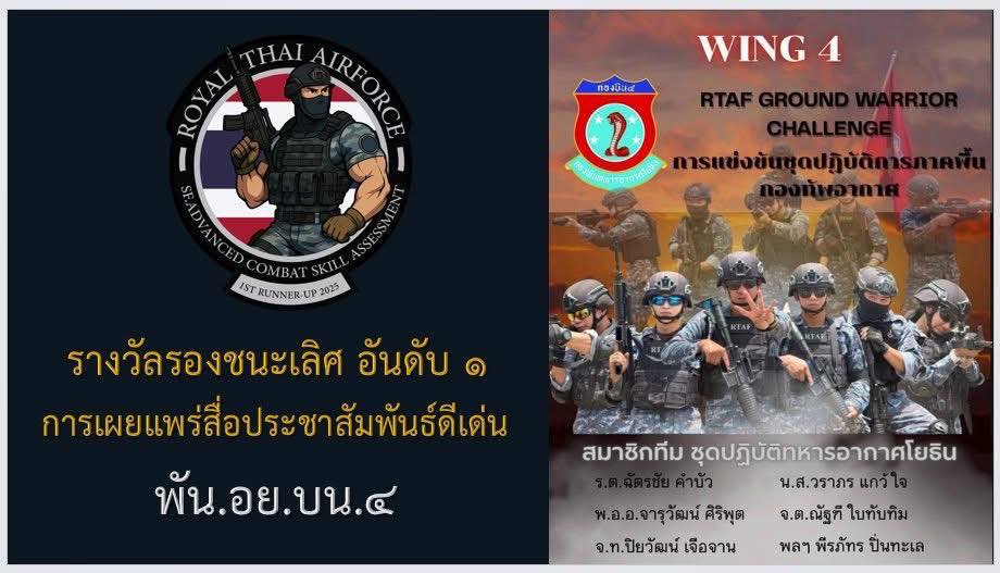 พลอากาศโท ขจรฤทธิ์ แก้วอำไพ ผู้บัญชาการหน่วยบัญชาการอากาศโยธิน เป็นประธานในการมอบโล่รางวัลการเผยแพร่สื่อประชาสัมพันธ์ดีเด่น การประเมินขีดความสามารถ ชุดปฏิบัติการภาคพื้น กองทัพอากาศ ประจำปี ๒๕๖๘ ในการนี้ นาวาอากาศโท รัฐพล ตรีธนะ ผู้บังคับกองพันทหารอากาศโยธิน กองบิน ๔ มอบหมายให้ นาวาอากาศตรี ศิววิศว์ หาญห้าว เป็นผู้แทนเข้ารับรางวัล ณ ห้องประชุมเจริญจรัมพร เมื่อวันที่ ๑๗ ธันวาคม ๒๕๖๘