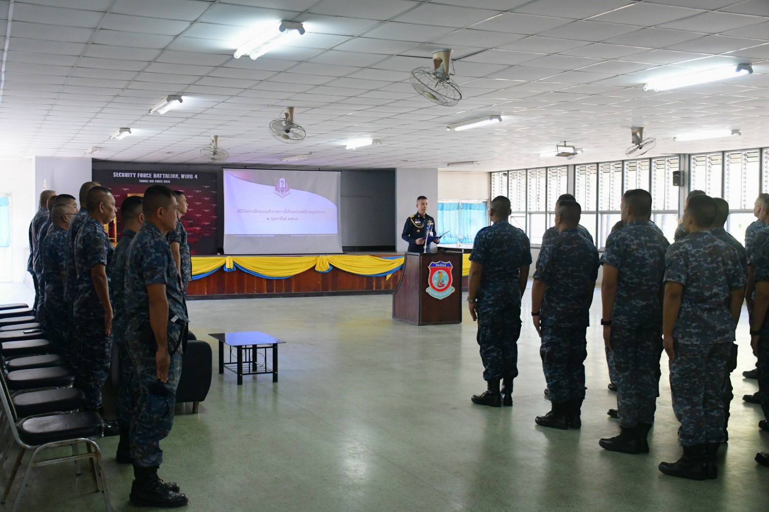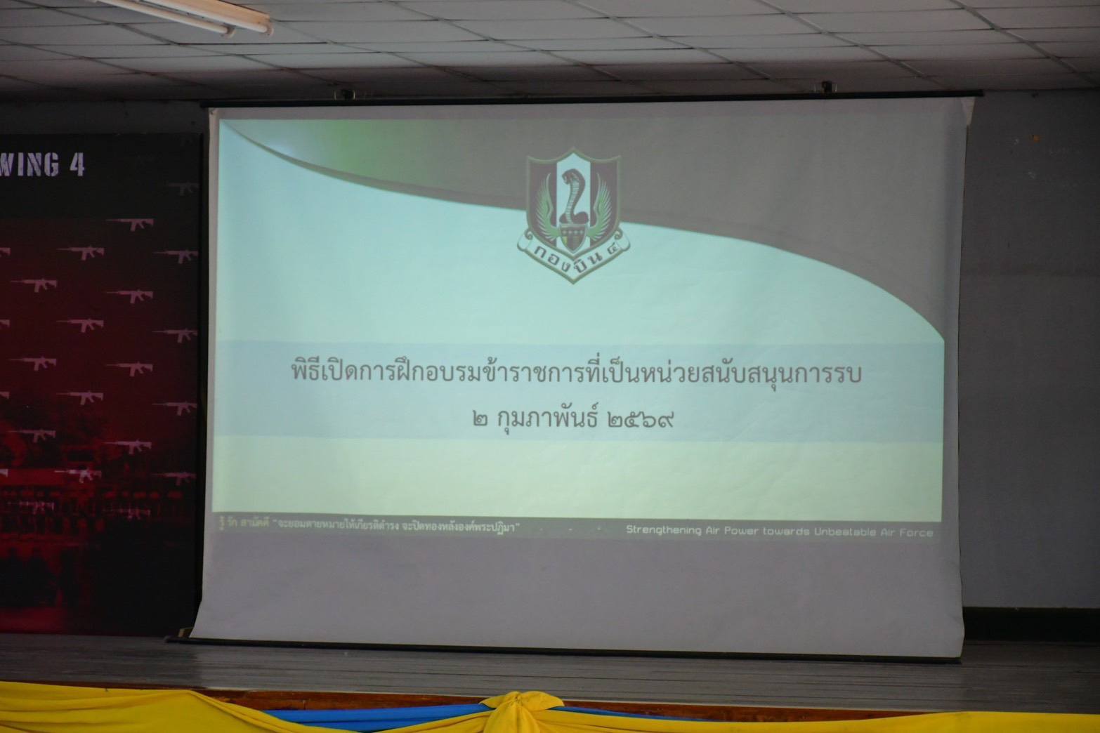 นาวาอากาศเอก วรพล ดิษฐ์แก้ว ผู้บังคับการกองบิน ๔ มอบหมายให้ นาวาอากาศเอก ณัฐพล ม่วงเรือง เสนาธิการกองบิน ๔ เป็นประธานในพิธีเปิดการฝึกอบรมข้าราชการหน่วยสนับสนุนการรบ กองบิน ๔ เพื่อเป็นการตรวจสอบความพร้อมรบและทดสอบแผนป้องกันที่ตั้งหน่วย ณ ห้องประชุม กองร้อยทหารอากาศโยธิน กองพันทหารอากาศโยธิน กองบิน ๔ เมื่อวันที่ ๒ กุมภาพันธ์ ๒๕๖๙